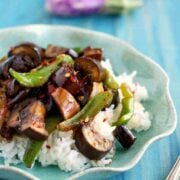 This spicy eggplant stir fry is so easy to make and is a delicious vegan dinner! The sweet and spicy sauce and fresh veggies makes this recipe a winner.
