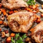 Chicken drumsticks, sweet potatoes, and pears are tossed with cinnamon, garlic, and olive oil then roasted until tender, caramelized, and golden brown. It's the ultimate family-friendly sheet pan chicken dinner recipe.