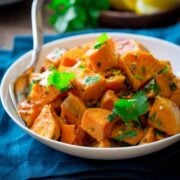 These roasted sweet potatoes are tossed with a bright and fresh citrus dressing as well as cilantro, shallot, and chive. A simple yet flavorful side dish!