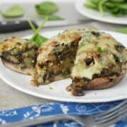 Swiss potato and spinach stuffed mushrooms are perfect for grilling or baking. This meatless, gluten free recipe is budget friendly, and easy enough for any cook to make! Simply cook the filling in a skillet, mix in cheese and stuff into the mushroom cap before grilling or baking!
