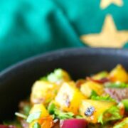 This sweet and spicy salad features grilled corn, bell peppers and red onions, arugula, feta, black beans and avocado! It can be a main dish or side salad.