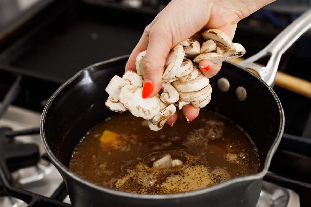 - Add frozen dumplings, mushrooms, and baby spinach to the boiling broth and simmer for 3 minutes until dumplings are warmed through and kale is wilted.