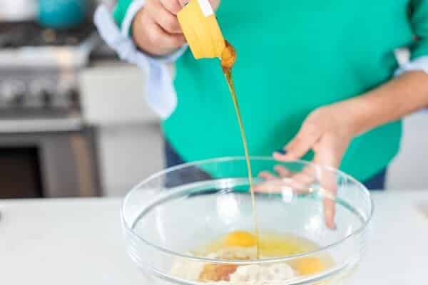 - With the whisk attachment in a stand mixer, beat together eggs, egg whites, honey, olive oil, and vanilla over medium speed until combined.