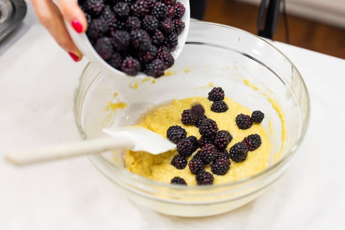 Next using a rubber spatula or wooden spoon, slowing fold in the fresh blackberries, being careful not to crush them.