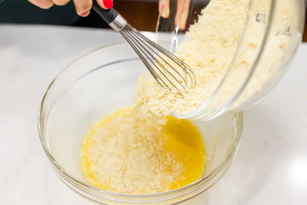 - Slowly add the almond flour mixture into the wet mixture while running over medium speed until fully blended.