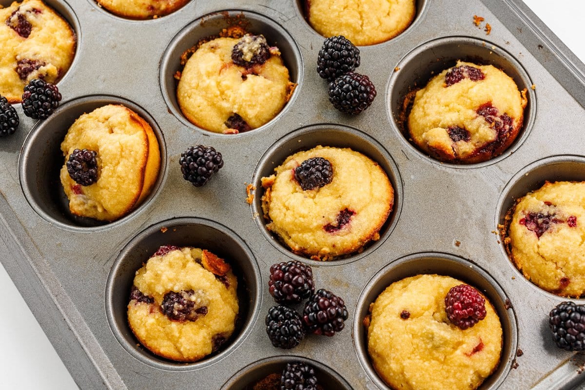 Once golden brown and a toothpick comes out clean, remove and let cool on a cooling rack. Then serve and enjoy your almond flour blackberry muffins!
