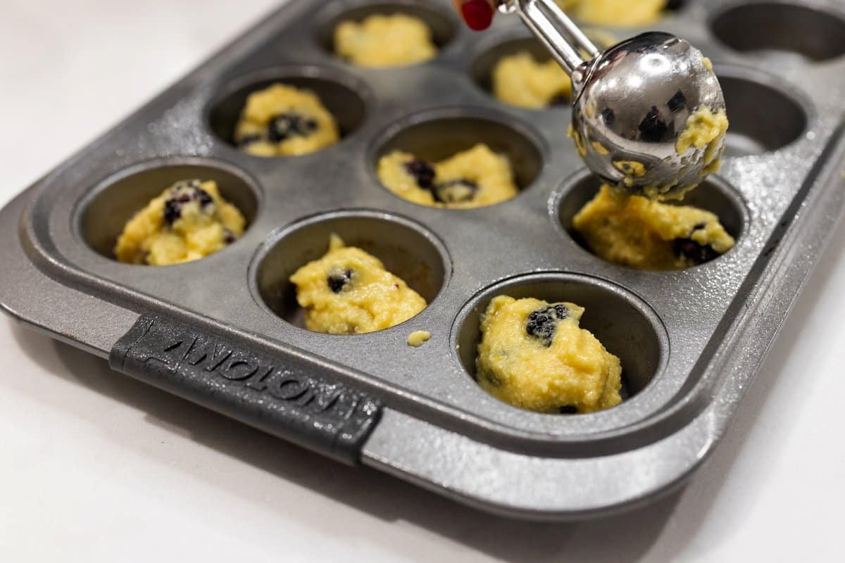- Using an ice cream scoop or large spoons, drop mixture evenly into lined muffin pan. It should be enough for 12 muffins.