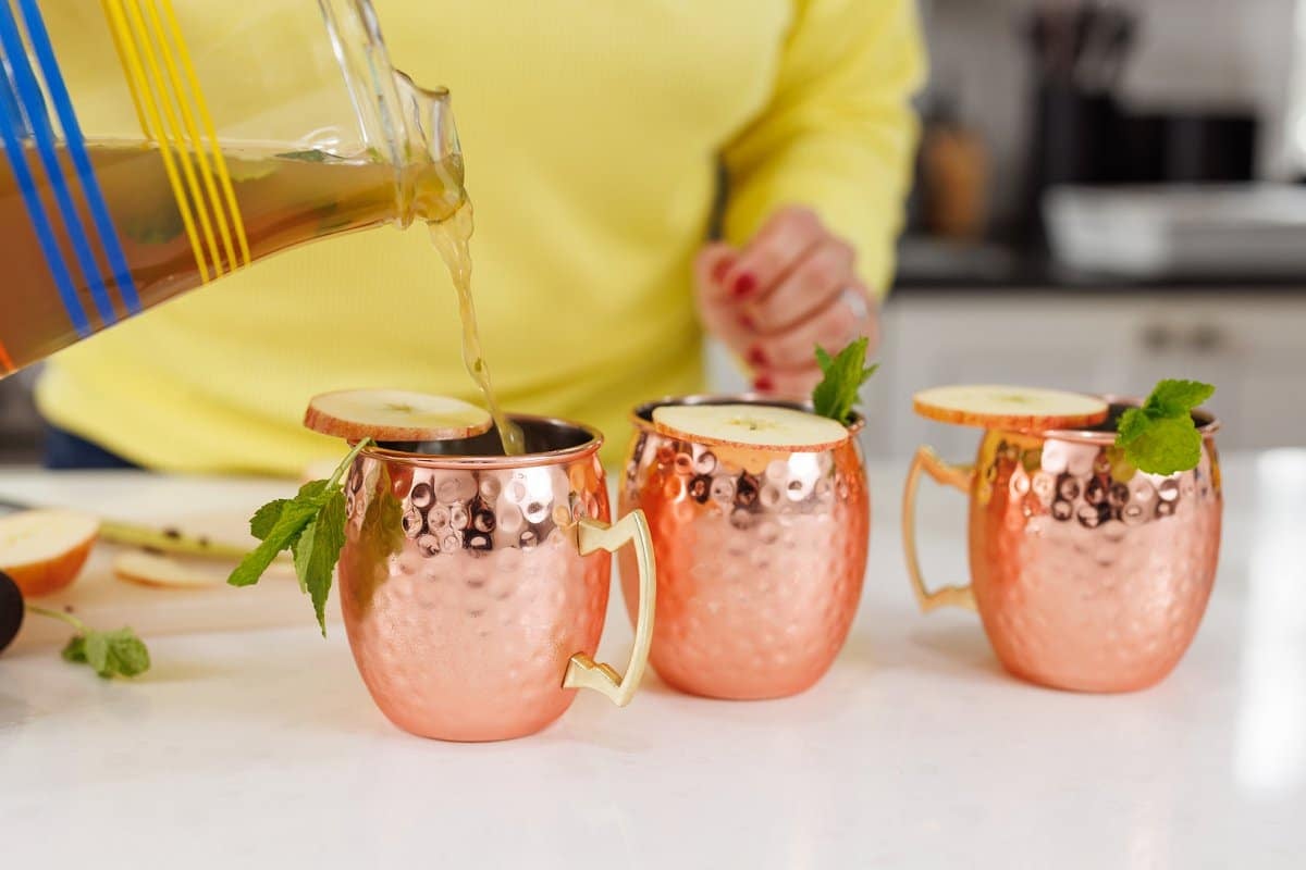 Strain the apple cider and vodka mixture over four copper mugs filled with ice.