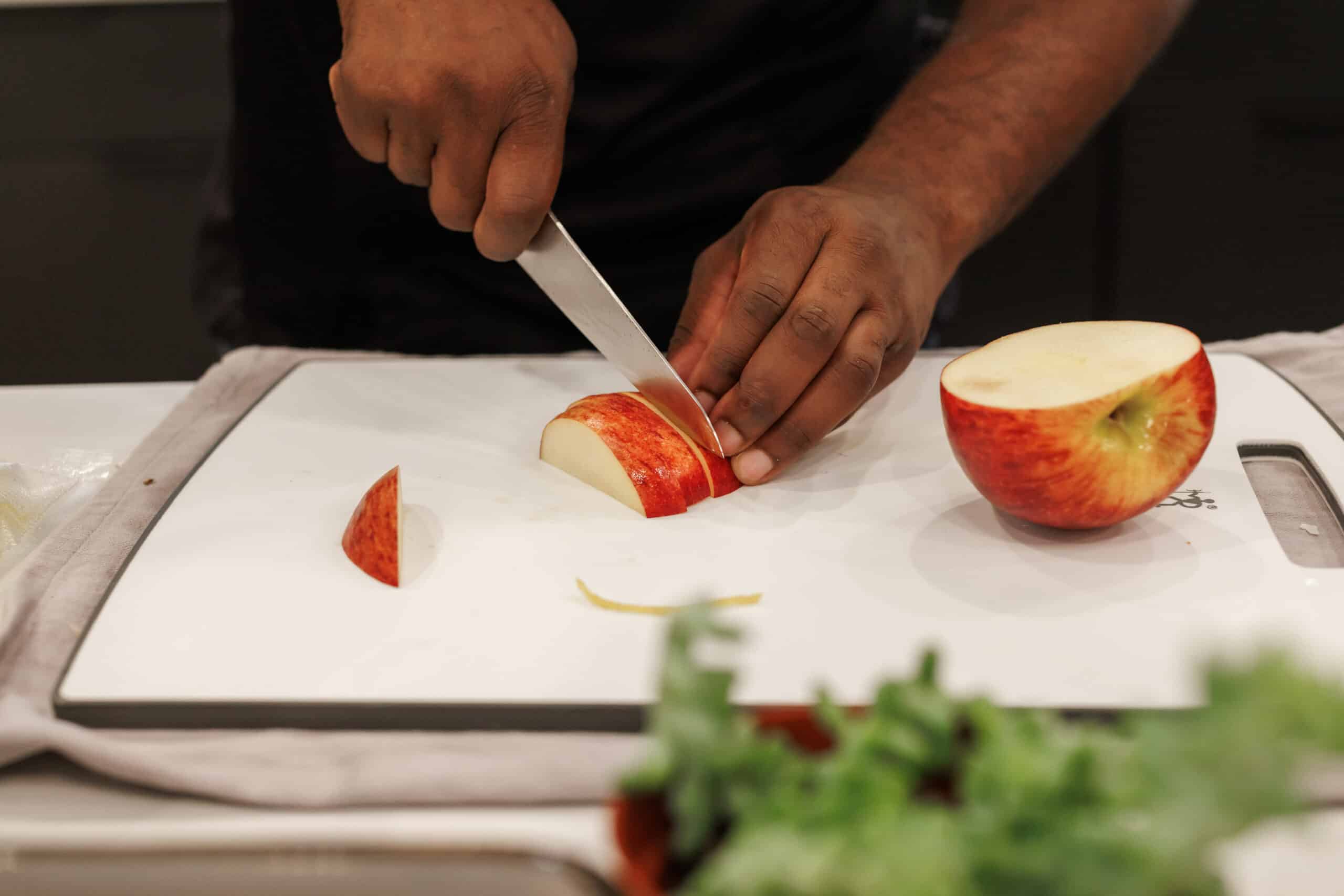 - Cut 4 Envy apples leaving the core untouched. Using a cold press juicer, press the Envy apples through the juicer and collect thej uice in a separate container; set aside for multiple uses later.