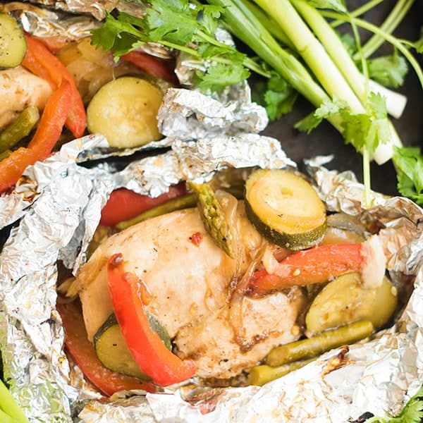 Chicken and vegetables are drizzled with a sesame ginger sauce and cooked in a tightly packed foil pouch to ensure tender, juicy chicken and flavorful veggies every time. An easy, gluten free Asian dinner recipe!