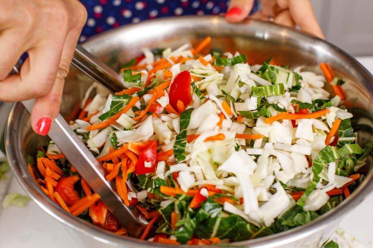 - Add all of the chopped veggies into the bowl and toss with the dressing until evenly coated. Season with salt and pepper to taste.