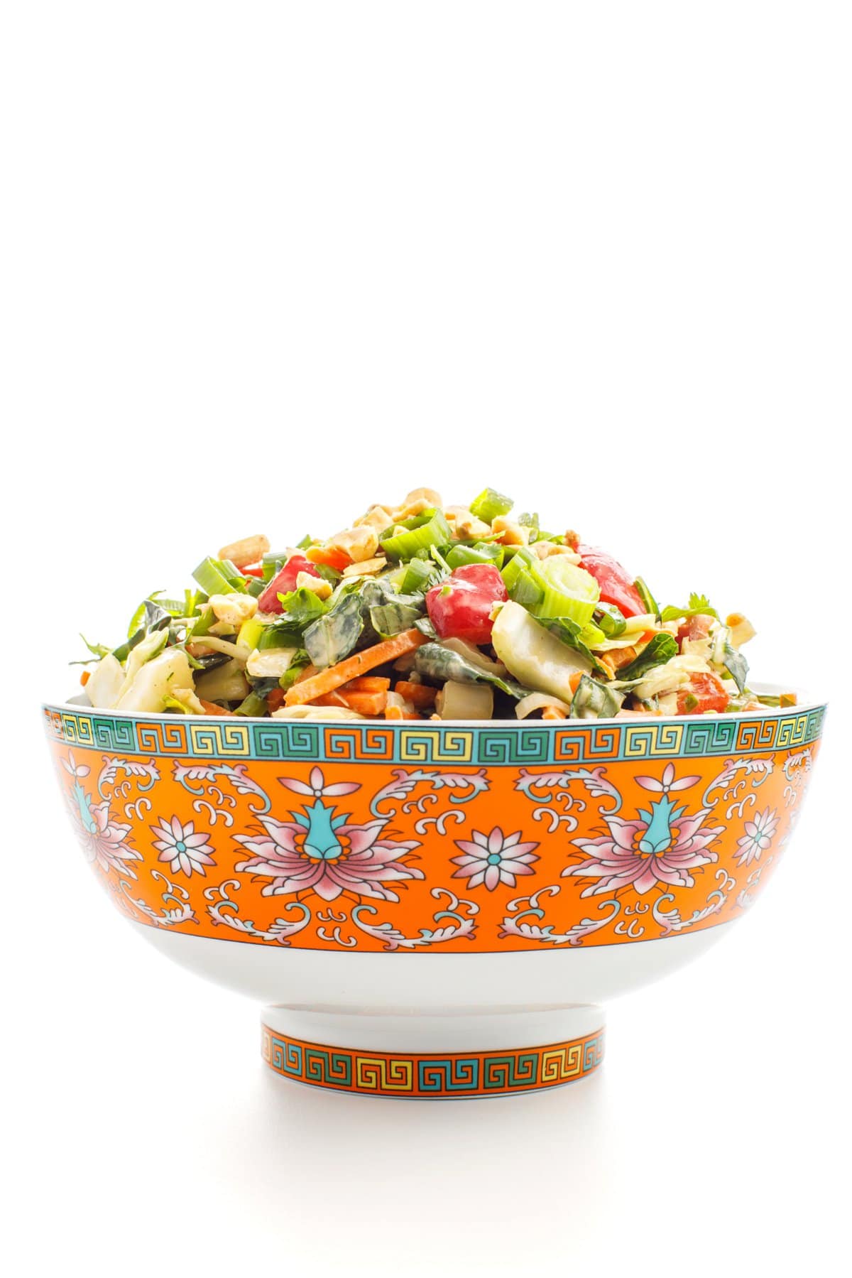 This fresh and flavorful Asian chopped salad is made with crunchy veggies that are tossed in a creamy, gingery peanut dressing.