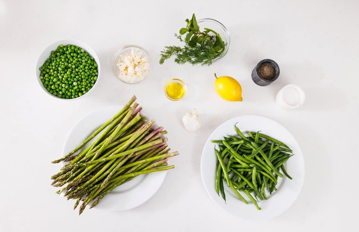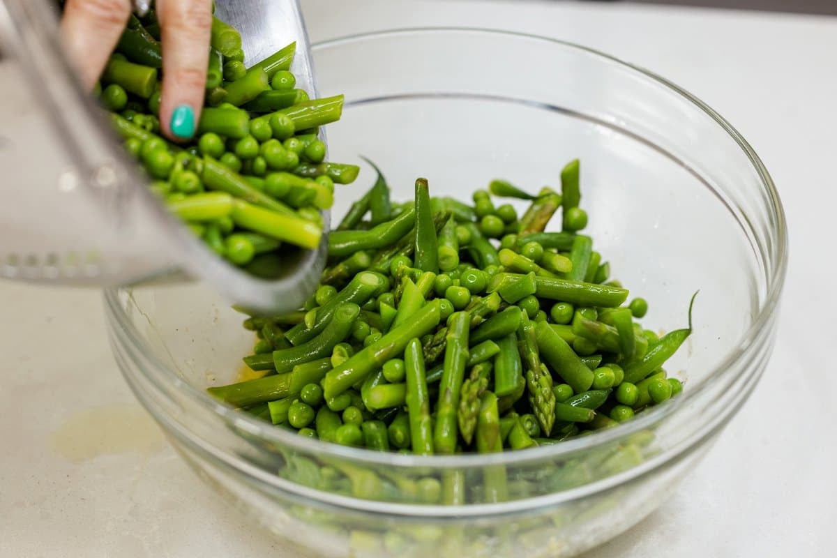 - Bring a large pot of salty water to a boil then add the green beans and asparagus. Cook for 2 minutes before adding in the green peas. Boil for an additional minute before removing with a slotted spoon and submerging in to a large bowl with ice water. Strain and place in a large bowl.