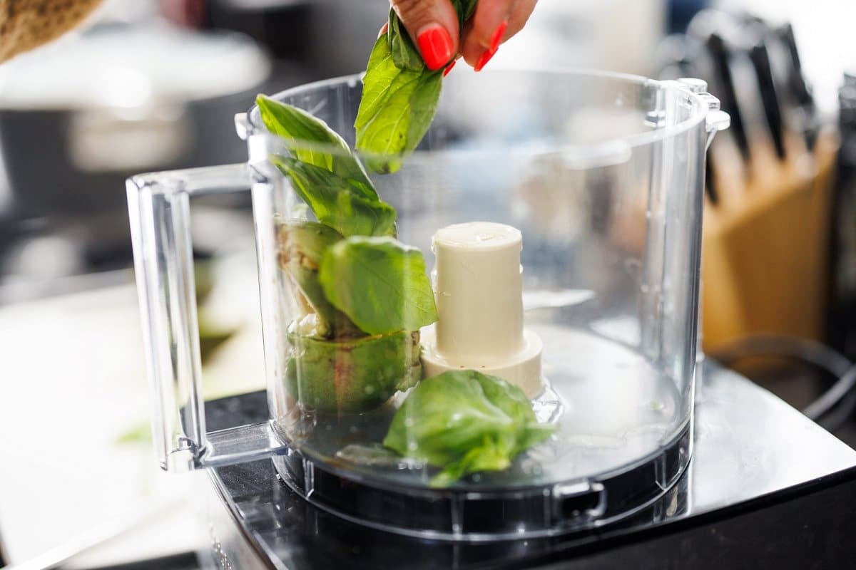 Then add your fresh basil leaves, trimmed green onions, and avocado to a food processor.
