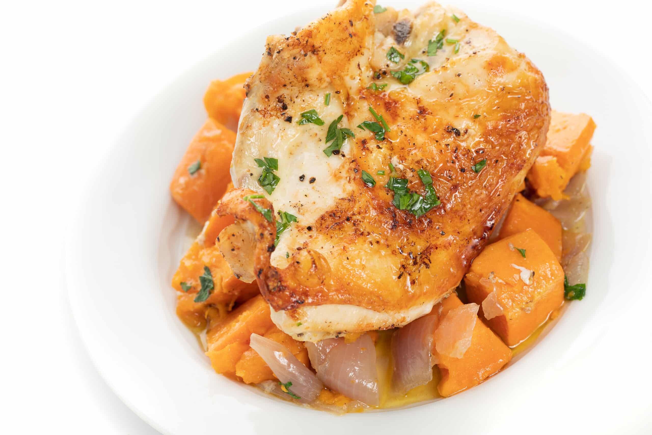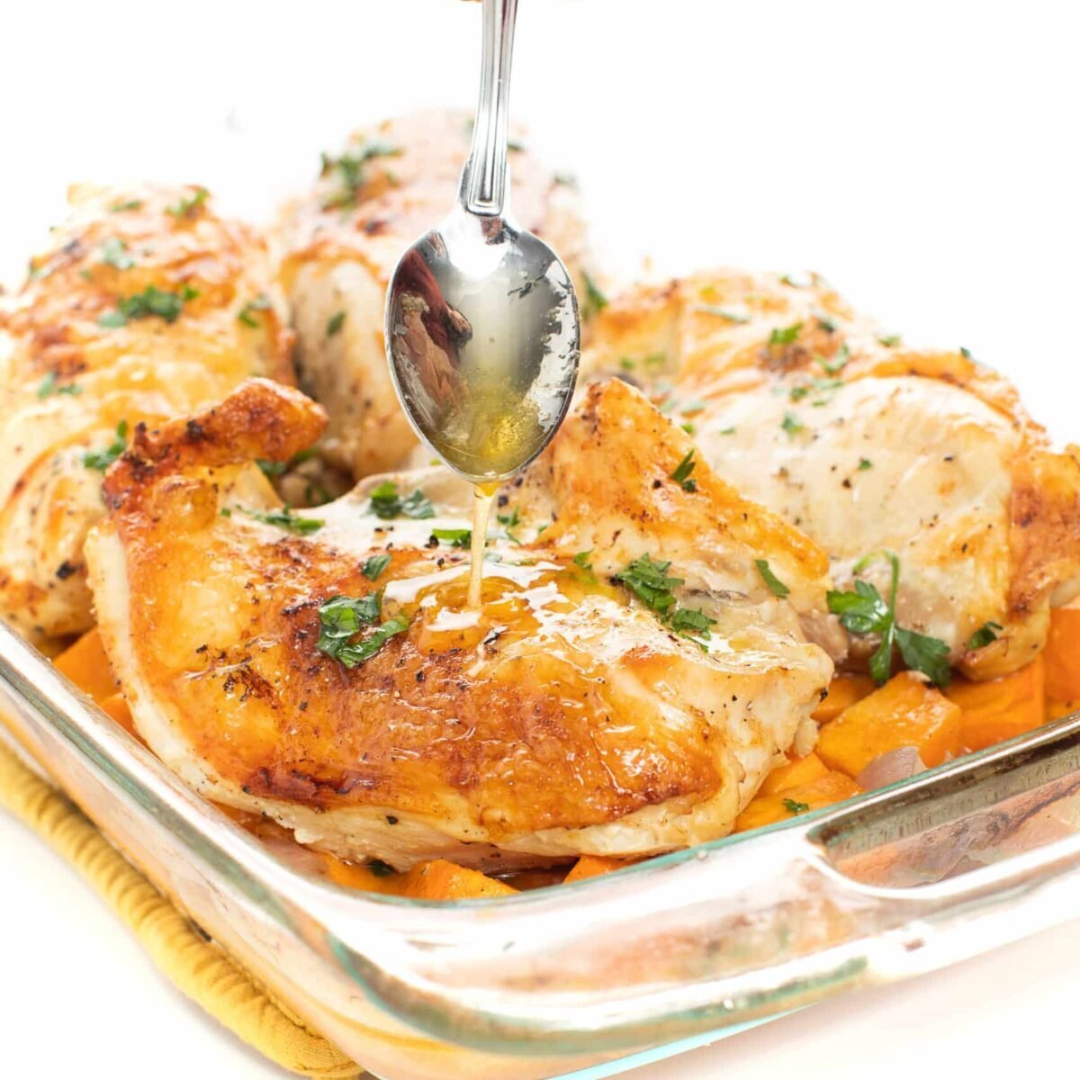 This easy baked chicken recipe is made with sweet potatoes, garlic, onions and white wine. Simple, comforting and delicious!