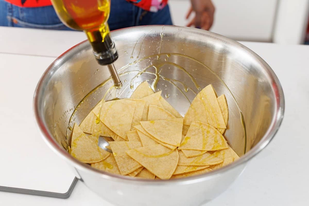 - Drizzle olive oil and spices over tortilla triangles and mix well so all tortillas are evenly coated in oil and spices. Don’t be afraid to use your hands!2 tablespoons extra virgin olive oil, 1 tablespoon cumin, 1 tablespoon smoked paprika, 1 teaspoon salt, 1/2 teaspoon pepper