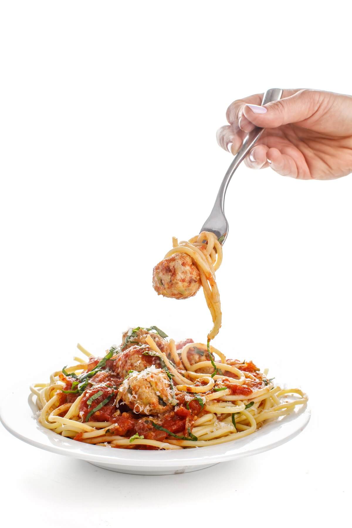 Broil them for a few minutes on each side before simmering in the sauce. This cooking method doesn’t require any extra fat and helps create a brown crust to lock in flavor. Fat is not the enemy, but I would much rather drizzle the finished dish with extra virgin olive oil than waste hundreds of calories simply browning the meatballs.
