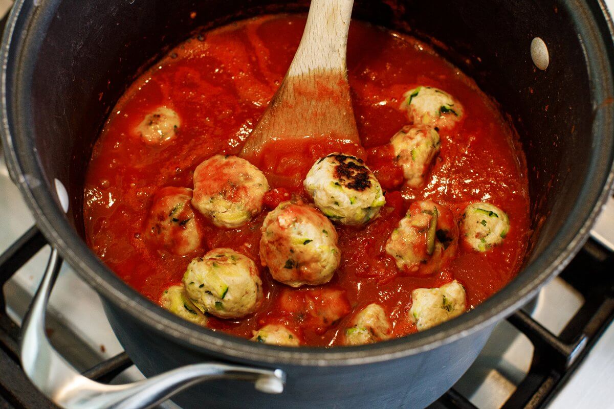 - Add the meatballs and half of the basil.
