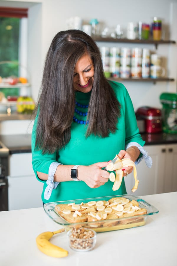 You repeat the layer one more time resulting in a hearty and satisfying banana nut stuffed French toast bake. Typically I’ll bake it Monday morning then keep it stashed in the refrigerator to quickly reheat during busy weekday mornings.