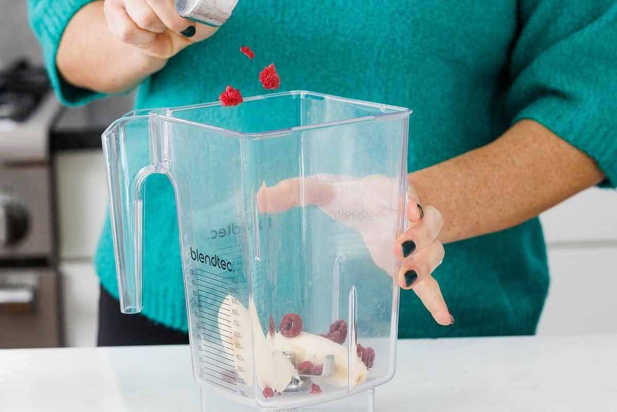 Start your banana raspberry chia smoothie by peeling your banana and adding it to your blender.