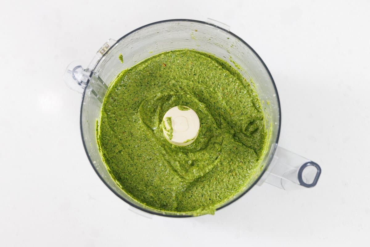 - Place the first seven ingredients in a high speed food processor and pulse a couple times to start breaking down the pesto.