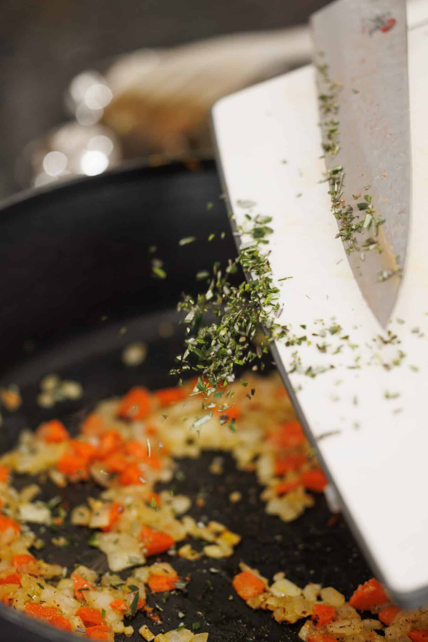 - Heat a large, deep skillet over medium high heat and drizzle with olive oil. Stir in onions, garlic and carrots along with a pinch of salt and pepper. Sauté until veggies are tender, about 6-7 minutes.
