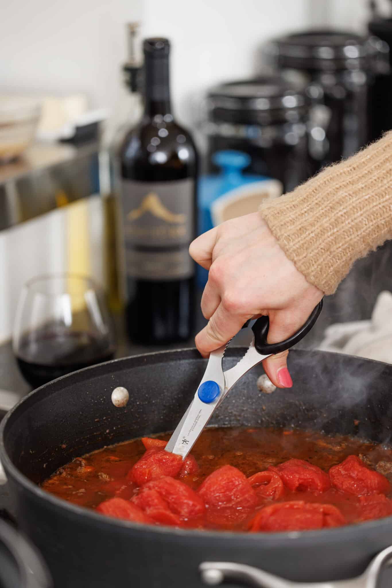 - Add broth to the pan and stir well then add in the whole peeled tomatoes. Using scissors, carefully begin breaking down the tomatoes in to bite-sized chunks. Bring pan to a boil then reduce heat to low. Season with a pinch more salt and pepper then simmer for 20 minutes before serving over cooked pasta. Garnish with cheese and basil if you wish. Serve over pasta if you wish.