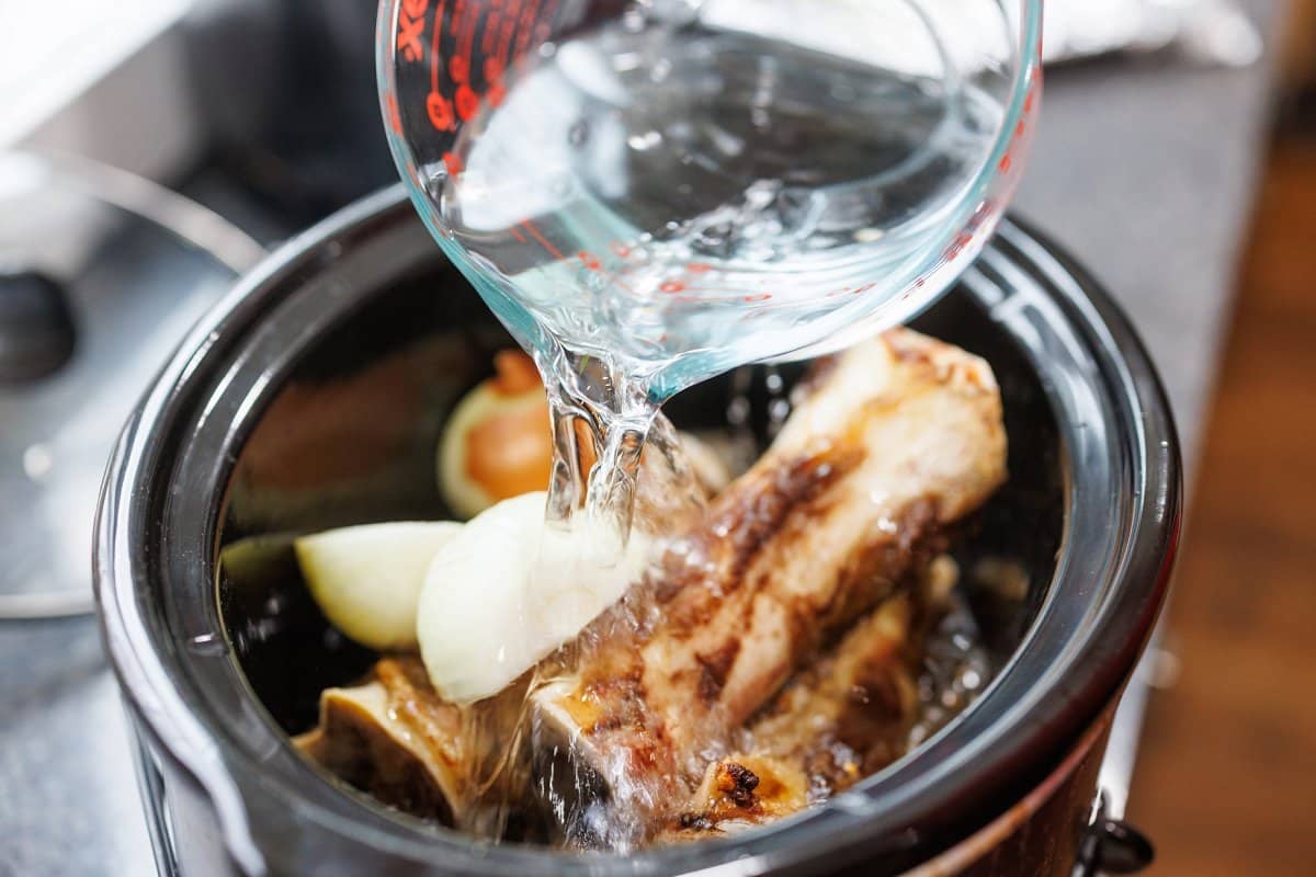 - Place roasted beef bones and all remaining ingredients in a large slow cooker and cover with 12-16 cups water (depending on the size of your slow cooker.) Heat on Low for 8 hours.