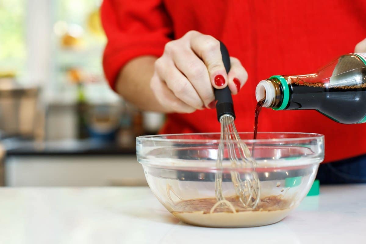 Then add the soy sauce, fish sauce, and lemon juice. Whisk with some warm water until fully mixed.