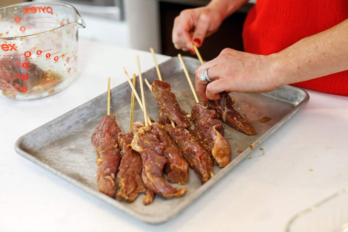 While the beef marinates, take your wooden skewers and soak them in water. This makes it so that they won’t catch on fire when cooking on the grill.