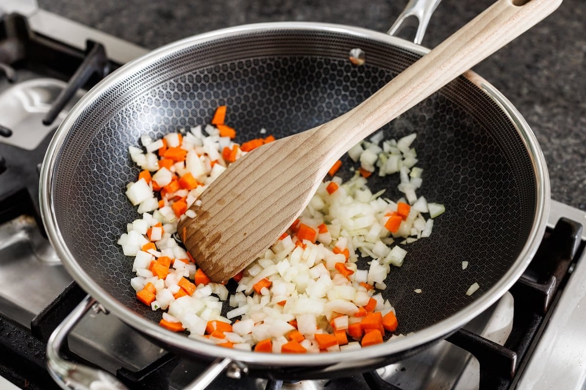 - Heat a large sauté pan over medium heat. Spray with cooking spray and add diced onion and carrot. Cook onion until softened, 3-4 minutes.1 medium onion, 1 carrot
