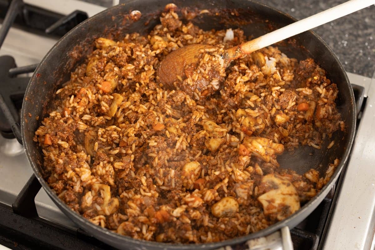 - Pour in the tomato sauce and cooked rice. Stir to combine and cook for an additional 2-3 minutes until mixture is warmed through. Check for seasoning and adjust accordingly before removing pan from the heat.14 ounce can tomato sauce, 1 cup cooked rice