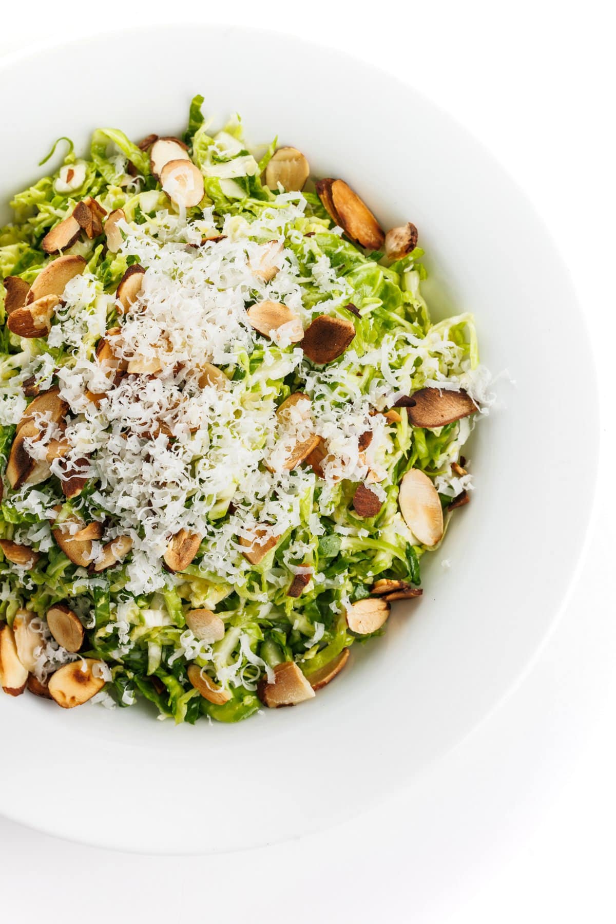 Crunchy, healthy, and versatile, a Brussels Sprout Salad with Lemon Parmesan Vinaigrette is a great winter salad. Heartier than a lettuce salad, a slaw made with Brussels is great for prepping ahead of time because it actually tastes better as they absorb more of the dressing. For added crunch, healthy fats, and texture, I toast pine nuts or almonds in the oven for about 6-7 minutes before sprinkling on top of the salad to serve.