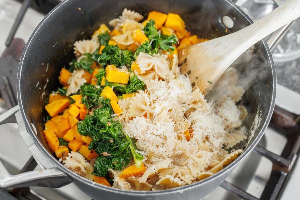 Butternut squash and sausage pasta is cooked with garlic and olive oil, while being tossed with wilted kale and nutty parmesan cheese.
