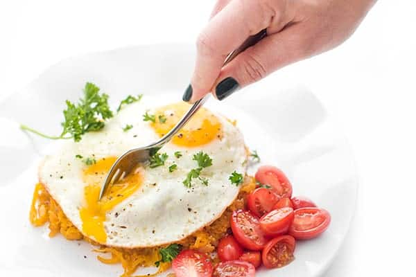 Butternut squash hash browns are seasoned then sautéed until crispy before being topped with fried eggs, or eggs any way you enjoy them! I love mine with a runny yolk but this recipe would be just as good with scrambled or poached eggs as well.