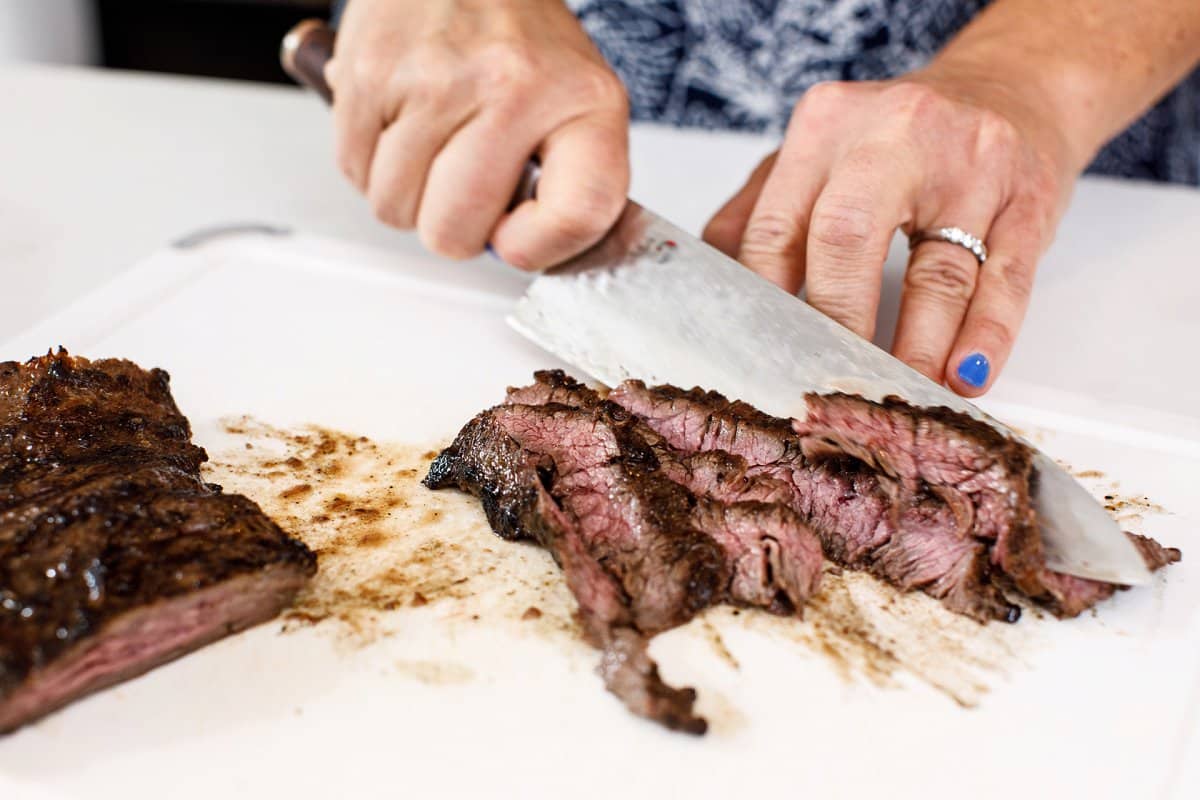 Let the steak rest for about 10 minutes, then cut it into strips against the grain.