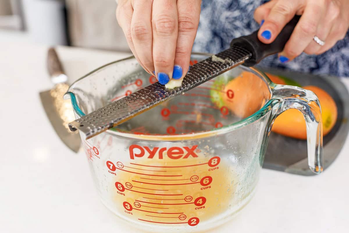 Next take a microplane and grate the garlic into the juice, and sprinkle in the cumin, cloves, salt, and pepper.