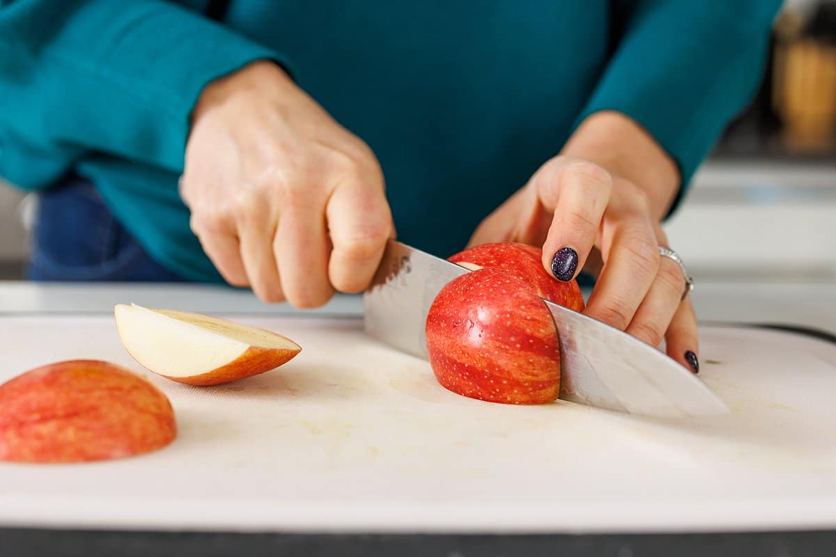 Start your smoothie by cutting and preparing all of the produce. Core and chop your apples, peel and cut the carrots, peel the banana, and slice your ginger.