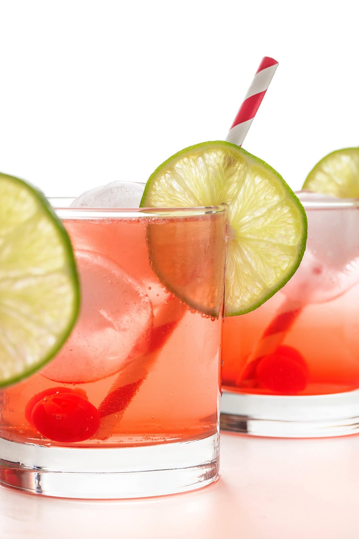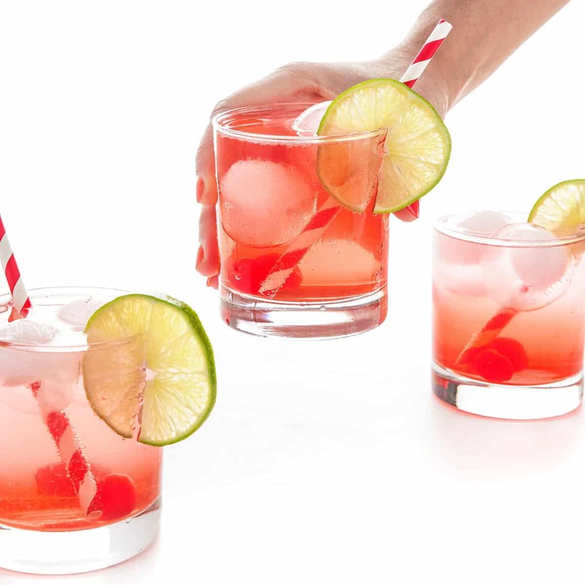 Garnish each glass with a lime slice and some maraschino cherries, and enjoy your Cherry Vanilla Vodka Soda!