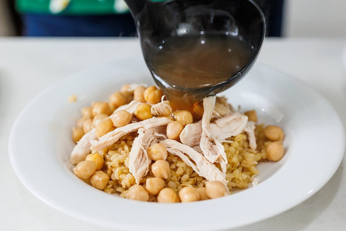 Then ladle over some of the hot bone broth that was used to cook the chicken.