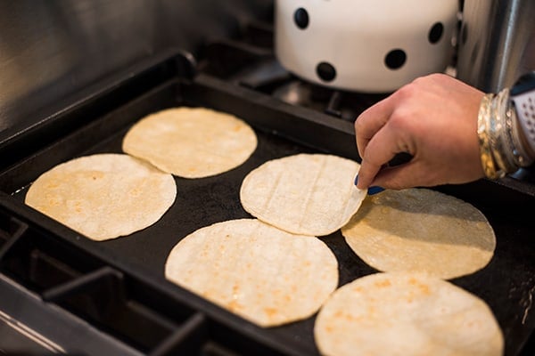 To prepare, the tortillas are lightly fried in oil in a nonstick skillet or griddle then dipped in salsa verde to soften. This keeps the corn tortillas from breaking apart when you fill and roll them.