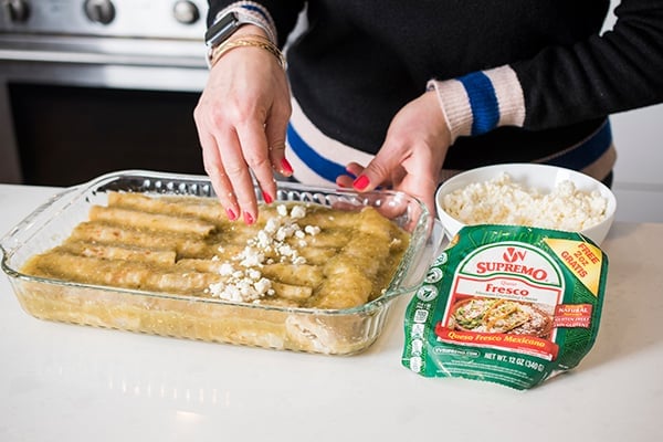What surprised me most was that the enchiladas are topped with just salsa verde and a light sprinkling of queso fresco before going into the oven. My queso fresco of choice is always V&V Supremo because their cheese is authentically made in the hand-crafted style of Central Mexico with pasteurized, grade “A” whole milk cows from Midwestern farms, and no added artificial hormones.