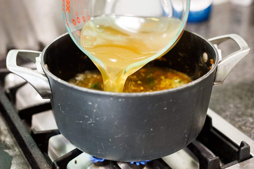 Step 8. Add the chicken broth to the pot and bring to a boil, then add the corn. Reduce heat and let simmer for about 20 minutes.