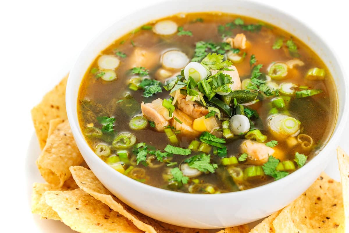 This broth-based chicken poblano soup recipe is made with tender cubes of chicken, mild poblano peppers, and sweet corn. Ideal for freezing or prepping ahead, it’s even better garnished with a lime wedge, fresh cilantro and tortilla chips.