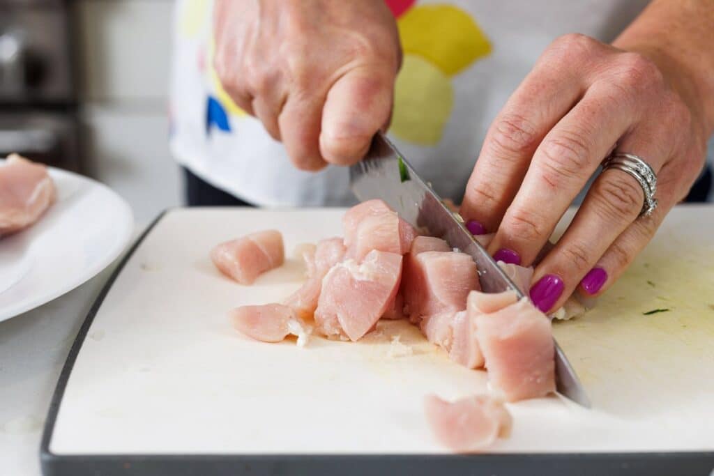 Step 3. Cut your chicken breasts into cubes.