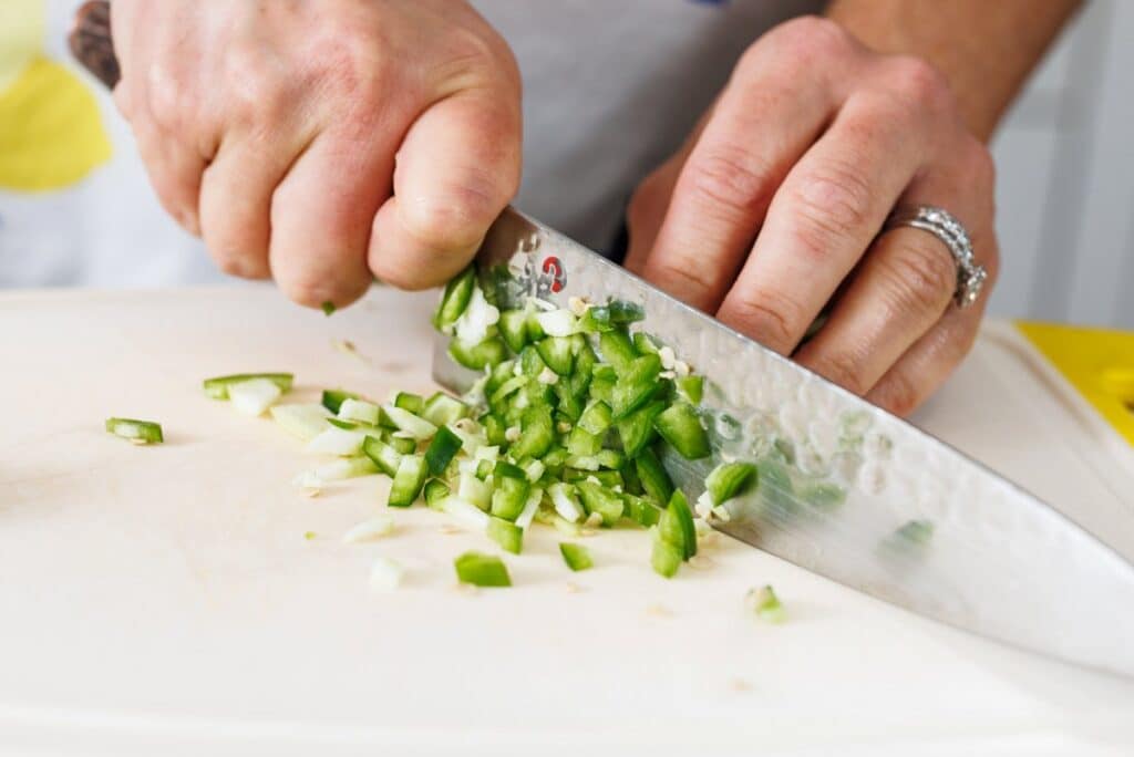 Step 2. Then dice your poblano pepper and onion.