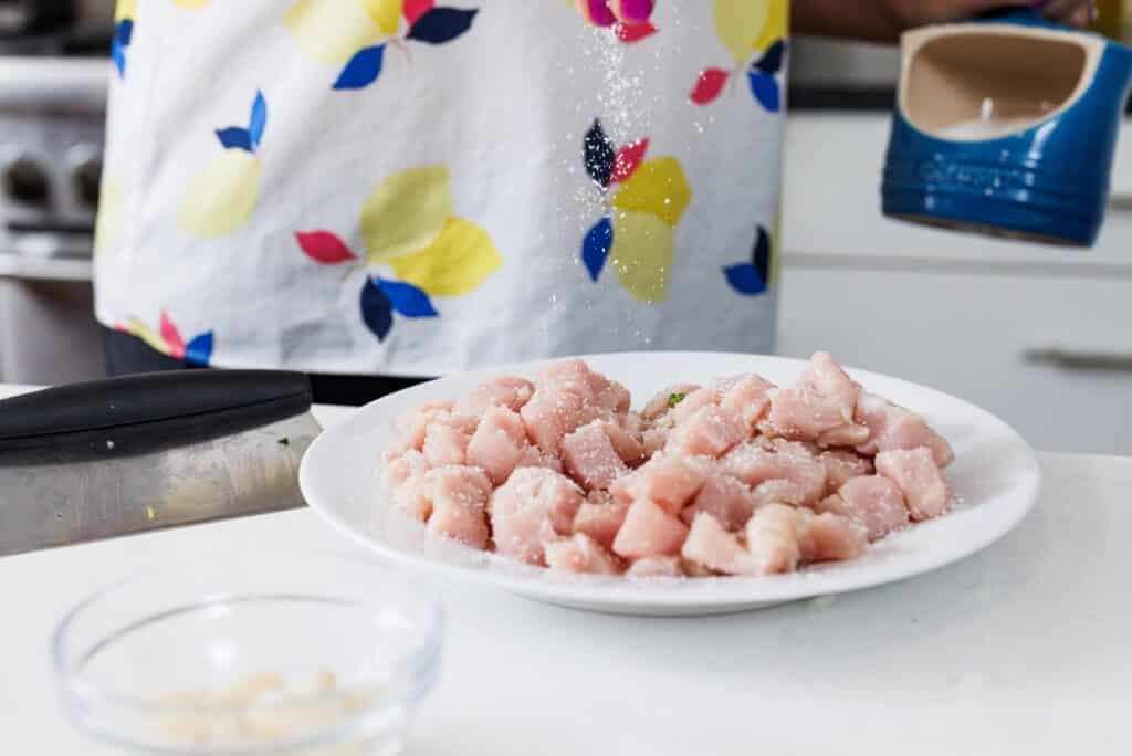 - Sprinkle chicken breast cubes with salt and pepper.1 pound boneless skinless chicken breasts, salt and pepper