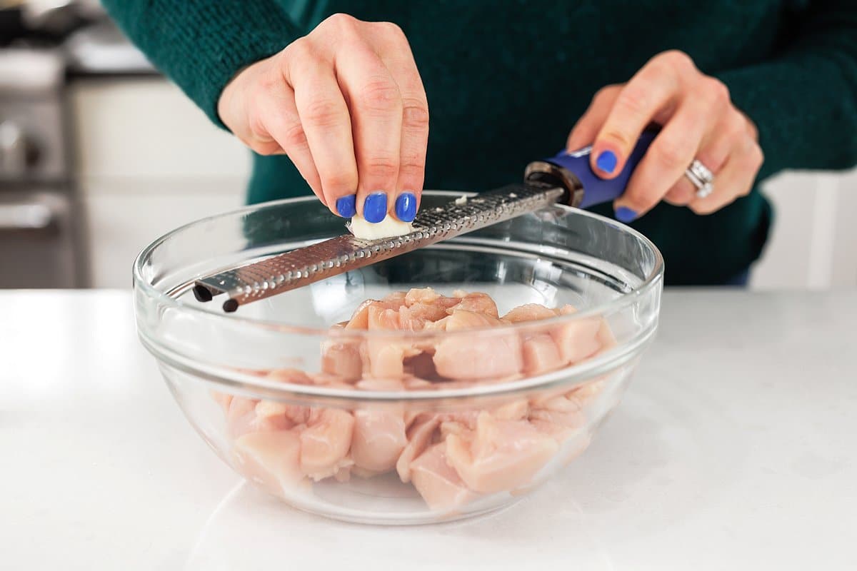Start your Chicken Tawook Fattoush Salad by marinating your chicken. Cut your chicken breasts, put the cubed chicken into a bowl, and add the garlic.
