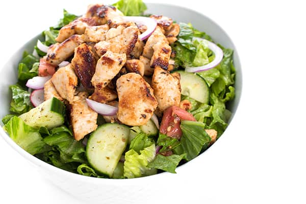 - While chicken is cooking, prepare Middle Eastern Syrian Salad. Serve cooked chicken tawook on top of salad.
