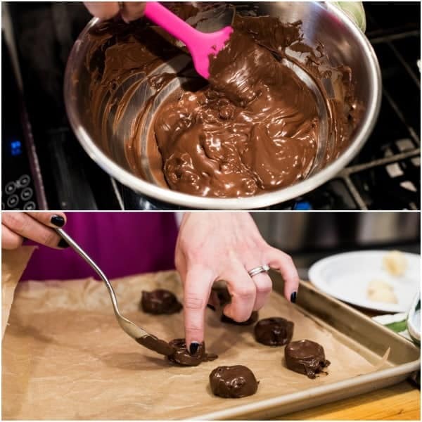 - Melt chocolate chips over a double boiler until smooth and creamy; remove from heat.